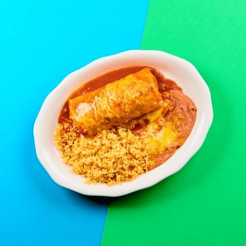 Flour tortilla, protein, sauce, melted cheese served with yellow rice, refried beans