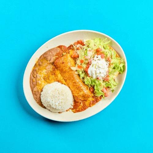 Two crispy flour tortillas, protein, sauce, cheese, guacamole, and sour cream. Served with yellow rice and refried beans