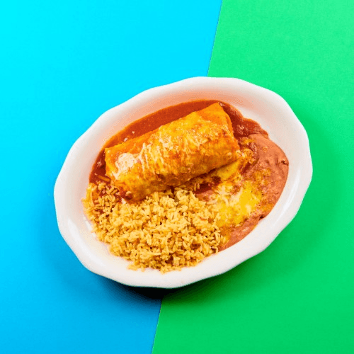 Green sauce and Monterey Jack cheese. Flour tortilla, protein, sauce, melted cheese served with yellow rice, refried beans