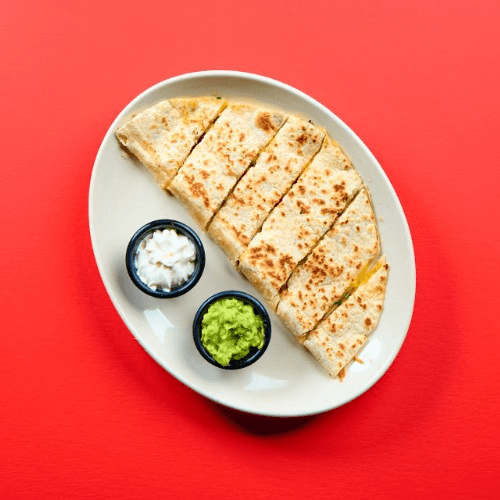Pressed flour tortilla, carne asada, Monterey Jack, guacamole, and sour cream