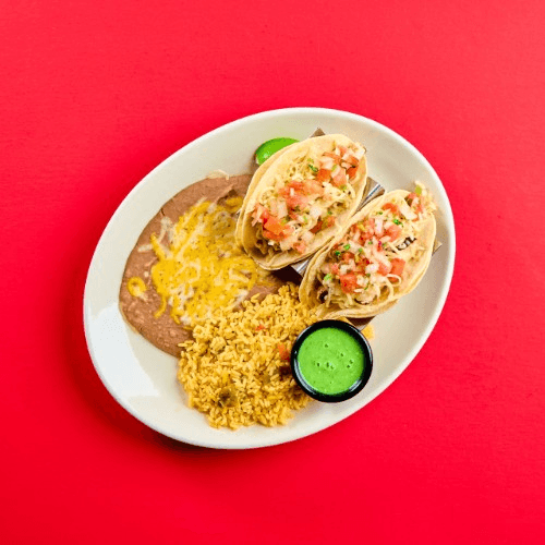 Two corn tortillas, protein, sauce, and melted cheese. Served with yellow rice and refried beans