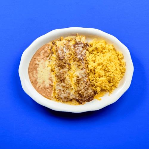 Monterey jack, cheddar, and sour cream. Two corn tortillas, protein, sauce, and melted cheese. Served with yellow rice and refried beans