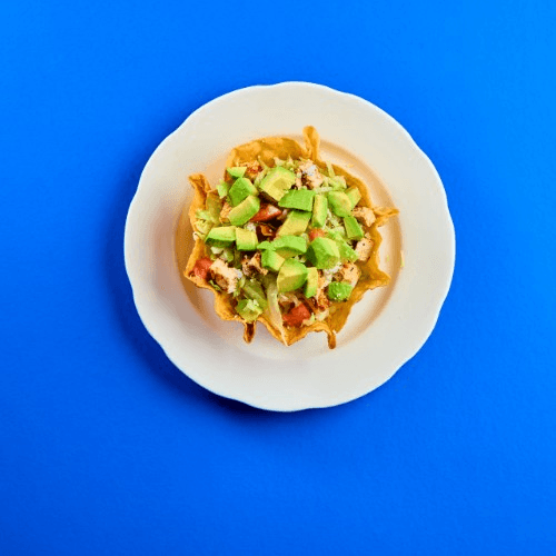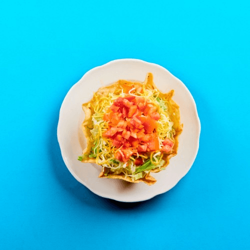 Crispy tortilla bowl, protein, lettuce, tomato, and cheese