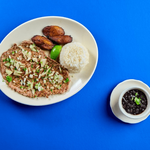 Shredded beef cooked with peppers, onions, tomatoes, and spices served with white rice, black beans, and ripe plantains.