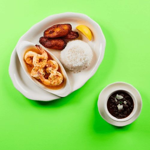 Shrimp and homemade garlic butter. Served with white rice, black beans, and plátanos