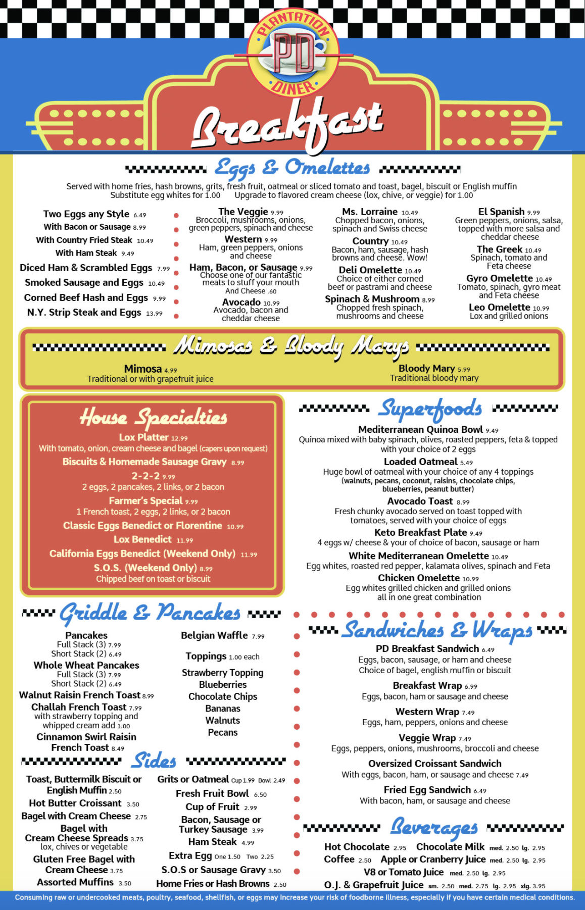 Diners are an iconic slice of Americana. The comfort food cooked up at Plantation Diner is as traditional as it gets. Big portions of your favorite fixings are served by the friendly wait staff all day long. The only thing you’ll like more than the food and the service is the prices! Stop by in the morning for a breakfast plate and a hot cup of joe. Come on in for lunch and dig into a delicious cheeseburger and a basket of fries. With daily specials you’re sure to find something delicious that won’t cost you an arm and a leg. Bring your friends and family and enjoy all your favorite traditional diner foods. If you’re on the go, the fast and friendly service at Plantation Diner will whip you up a hearty meal in no time.